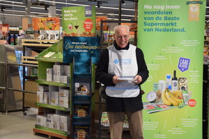 Vrijiwilliger en Vincentiusberstuurder Sjan brengt haar enthousiasme over een bezoeker aan de supermarkt
