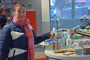 Vrijwilliger Lyanne moedigt het winkelend publiek in de Plus aan levensmiddelen af te geven